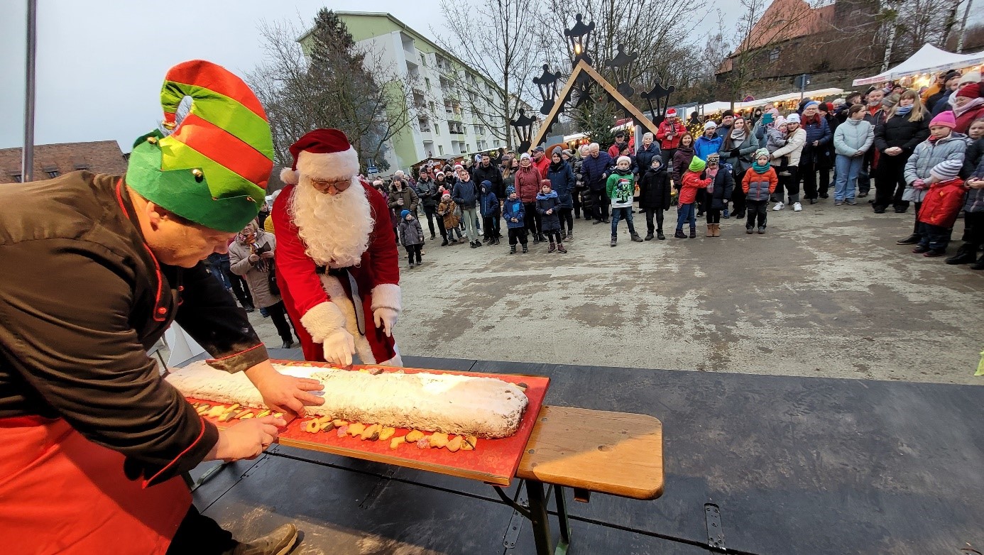 Der Weihnachtsmann hat mit Robert Winter den Riesenstollen angeschnitten, welcher anschließend von der Klasse 4 im Stollencafé angeboten wurde. Vielen Dank an die Bäckerei Walther, die diesen wieder zur Verfügung gestellt hat und die Erlöse für die Abschlussfahrt sind.